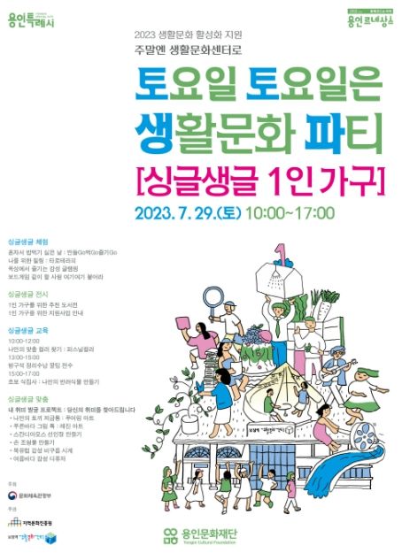 [제주교통복지신문 김강석 기자] 용인문화재단은 오는 29일 보정역 생활문화센터에서 ‘토요일 토요일은 생활문화 파티-싱글생글 1인 가구’ 프로그램을 개최한다고 밝혔다.