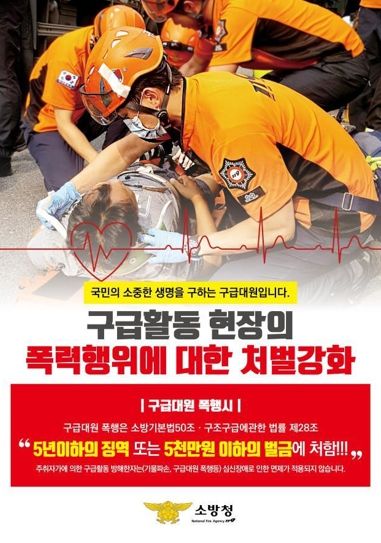 이에 소방서는 구급대원 폭행 피해 예방을 위해 ▲다기능 조끼, 웨어러블 캠 등 장비 보급 확대 ▲폭행 피해 예방·대응을 위한 교육 ▲홈페이지·SNS 등에 구급대원 폭행 근절 홍보 등을 추진하고 있다.
