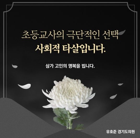 유 의원은 입장문을 마무리하며 “사회적 타살입니다. 20대 젊은 교사가 극단적인 선택을 할 때까지 방관한 교장, 지역교육을 총괄하는 교육감, 교사들의 처우 및 교육제도를 총괄하는 교육부 장관, 이들 중 한 명이라도 자신의 책무를 온전히 감당했다면 이렇게까지 되진 않았을 것”이라며 “가장 힘없는 자가 고통을 감내해야만 하는 우리 교육행정시스템이 낳은 사회적 타살”이라며 해당 죽음이 사회적 타살임을 명확히 했다.
