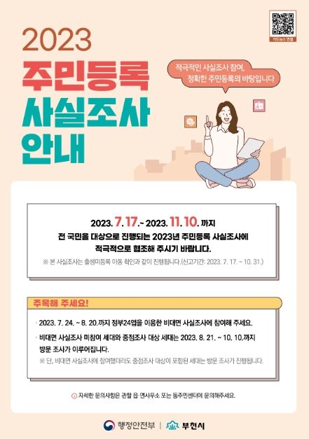 [제주교통복지신문 김강석 기자] 부천시는 전 시민을 대상으로 7월 17일부터 11월 10일까지 ‘2023년 주민등록 사실조사’를 실시한다. 또한 이번 사실조사 기간 중 ‘출생미등록 아동 신고기간’(7.17.∼10.31.)도 함께 운영한다.