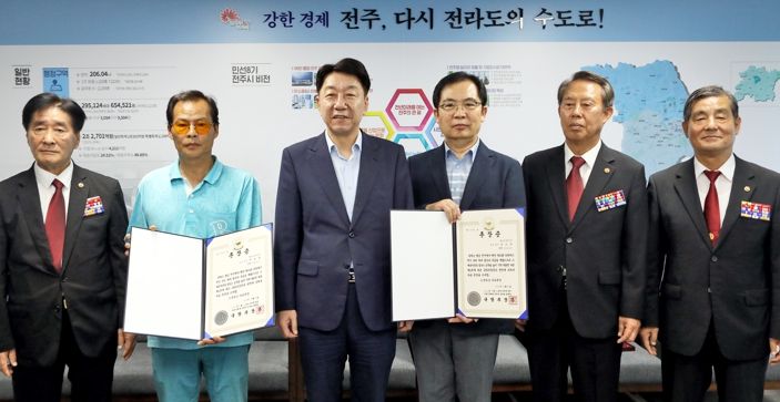 우범기 전주시장은 21일 전주시장실에서 6.25 전쟁 중 전사한 故 김노성 중사와 故 전윤권 일병의 유족에게 화랑 무공훈장을 전도 수여했다.