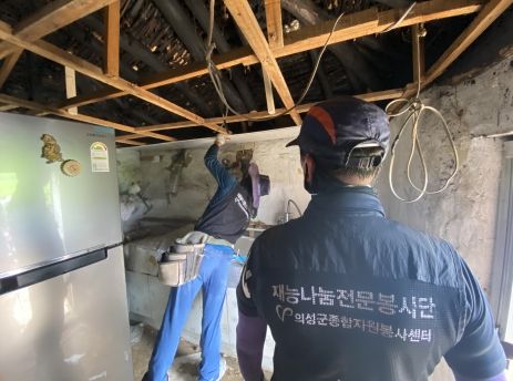 지난 며칠간의 폭우로 인해 천장 일부가 파손된 대상자의 집수리를 위해 1차적으로 대상자 스스로 청소 및 주변정리를 실시한 후 의성군자원봉사센터에서 천장보수 등 쾌적한 주거환경이 되도록 집수리 활동을 무료로 지원했다.