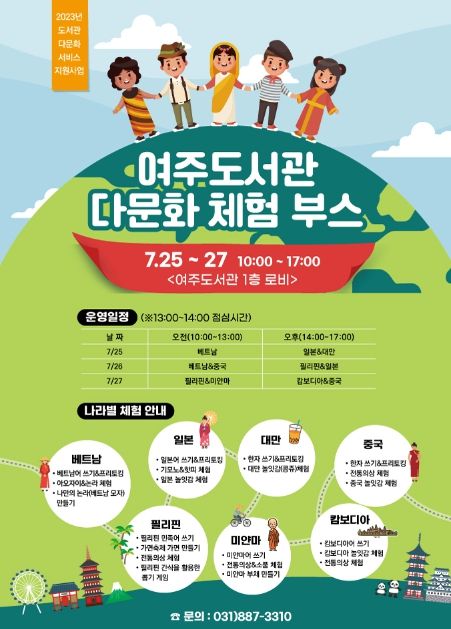 [제주교통복지신문 김강석 기자] 여주시 평생교육과 여주도서관은 문화체육관광부가 추진하는 '2023년 도서관 다문화서비스 지원사업'에 선정되어 7월 25일부터 27일까지 '다문화 체험 부스'를 운영한다.