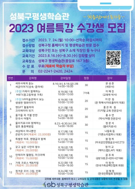 [제주교통복지신문 김강석 기자] 서울 성북구가 한여름 휴식처인 성북구평생학습관에서 시원하게 즐길 수 있는 여름특강을 운영한다.