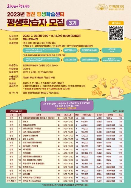 [제주교통복지신문 김강석 기자] 광주시 검천평생학습센터는 25일부터 내달 16일까지 23일간 광주시민 대상 평생학습 프로그램의 수강생을 모집한다고 21일 밝혔다.