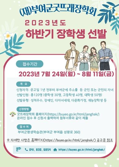 [제주교통복지신문 김강석 기자] (재)부여군굿뜨래장학회는 7월 24일부터 8월 11일까지 2023년도 하반기 굿뜨래 장학생 신청서를 접수한다.