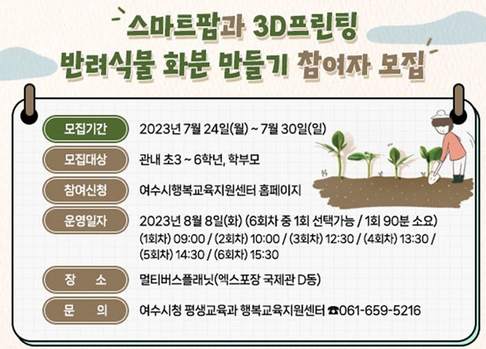 [제주교통복지신문 김강석 기자] 여수시가 여름방학을 맞아 오는 8월 8일 초등학생 3~6학년과 학부모를 대상으로 ‘스마트팜과 3D프린팅 반려식물 화분 만들기’를 운영한다.
