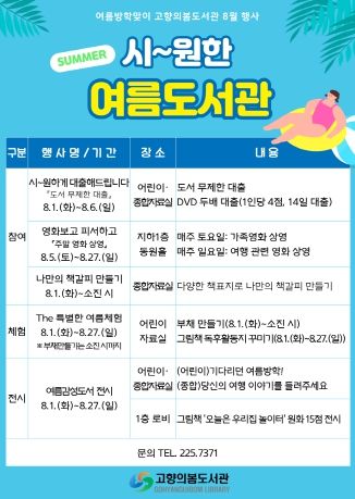 [제주교통복지신문 김강석 기자] 창원특례시 고향의봄도서관에서는 여름방학을 맞이하여 이용자들을 위한 “시~원한 여름도서관” 행사를 운영한다.