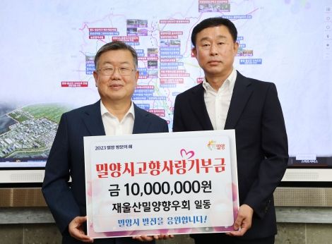 기탁식에 참석한 이양규 재울산밀양향우회장은 “고향사랑기부제로 고향 사랑을 실천하는데 많은 향우분들이 동참했다”며 “고향을 사랑하는 마음은 전국 최고다”라고 전했다.