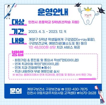 [제주교통복지신문 김강석 기자] 인천광역시 계양구는 청소년기 학생들의 구강질환 예방을 위해 ‘아동치과주치의사업’을 추진한다.