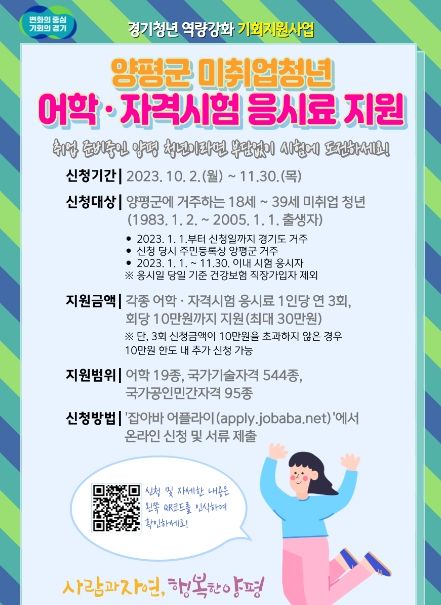 [제주교통복지신문 김강석 기자] 양평군이 2023년 하반기부터 미취업 청년(18세~39세)을 대상으로 '경기청년 역량강화 기회지원 사업'을 추진한다. 고른 취업기회 제공과 취업 준비 비용부담 완화를 위해 취업에 필요한 어학(자격)시험 응시료를 지원하는 사업이다.