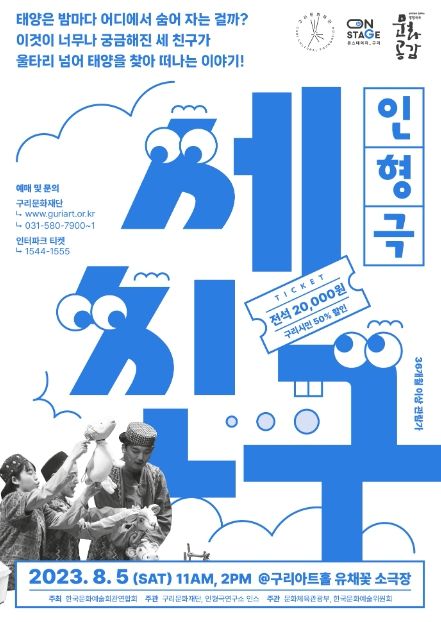한편, 인형극 '세친구'는 구리문화재단이 한국문화예술회관연합회의 ‘2023년 문예회관과 함께하는 방방공곡 문화공감사업’ 민간 우수공연 프로그램 지원사업으로 선정되어 구리시민 및 관객들에게 문화 향유의 기회를 확대하고자 마련된 공연이다.