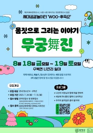 이번 프로그램은 ‘몸짓으로 그리는 이야기-무궁舞진’ 이라는 주제로 지역 어르신·청소년·지역예술가(무용가)가 함께 관찰하기를 통해 다양한 움직임을 만들어보고 표현해 보는 창작활동 프로그램으로 진행될 예정이다.