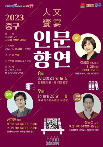 [제주교통복지신문 김강석 기자] 인천시 중구는 삶과 교육, 과학기술 등 다양한 분야의 명사를 초청, 평생학습 인문학 공개 특강 ‘2023년 중구 인문향연(人文饗宴)’을 개최한다고 21일 밝혔다.