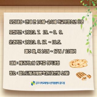 [제주교통복지신문 김강석 기자] 김포시청소년재단 학교밖청소년지원센터는 2023년 학교 밖 청소년의 자립과 성장 지원을 위한 자립기술훈련 ‘제과기능사 자격증반’ 참여자를 모집한다.