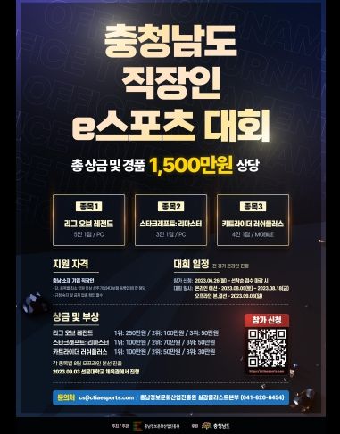 대회 종목은 리그 오브 레전드(5인 단체전), 카트라이더 러쉬 플러스(4인 단체전), 스타크래프트(3인 단체전)로 충남에 있는 기업 직장인이면 누구나 참가 신청을 할 수 있다.