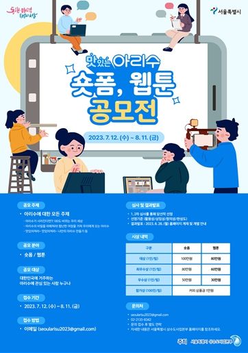 공모전은 숏폼, 웹툰 2개 분야로 자유주제이며, ‘아리수가 사라진다면?! 180도 바뀌는 우리 세상’, ‘아리수의 비밀을 파헤쳐라! 험난한 여정을 거쳐 우리에게 오는 아리수’, ‘맛있어져라~ 맛있어져라~ 나만의 아리수 만들기’ 등 다양하고 자유롭게 ‘맛있는 아리수’를 표현하면 된다.