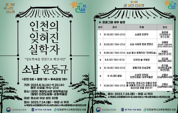 [제주교통복지신문 김강석 기자] 인천광역시교육청계양도서관(관장 오태환)은 8~9월 2023년 도서관 '길 위의 인문학' 사업으로 ‘인천의 잊혀진 실학자 – 성호학파를 인천으로 확산시킨 소남 윤동규’ 인문학 강좌를 운영한다고 21일 밝혔다.