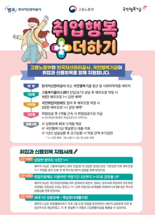 고용부 등 3개 기관은 「취업행복+더하기 채무조정」 제도를 마련하고, 청년·취약계층 금융 채무자가 고용노동부의 고용복지+센터 초기상담 및 국민취업지원제도의 취업 서비스에 참여 시 신용회복을 위한 추가 채무감면 및 취업지원성공지원금 등 각종 금융 인센티브를 받을 수 있도록 지원한다.
