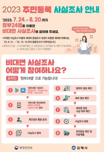 2023년 주민등록 사실조사는 지난 17일부터 오는 11월 10일까지 이뤄지며 비대면 디지털 조사(7.24∼8.20)와 이·통장, 읍·면·동 공무원이 거주지를 방문해 확인(8.21∼10.10)하는 방식으로 진행된다. 사실조사 결과 주민등록사항을 고칠 필요가 있을 경우 지방자치단체가 최고·공고 절차를 거쳐 직권으로 수정한다.