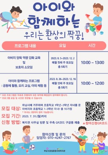 [제주교통복지신문 김강석 기자] 하남시감일종합사회복지관(사회복지법인 휴먼복지회 운영)에서 아빠와 자녀가 함께하는 가족기능강화 프로그램 “우리는 환상의 짝꿍!”을 진행하여 참여자를 내달 31일까지 모집한다.