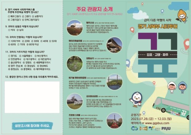 [제주교통복지신문 김강석 기자] 김포시와 고양시, 파주시의 주요 관광지를 투어할 수 있는 경기 서북부 광역시티투어가 이달 28일부터 12월 3일까지 운영된다.