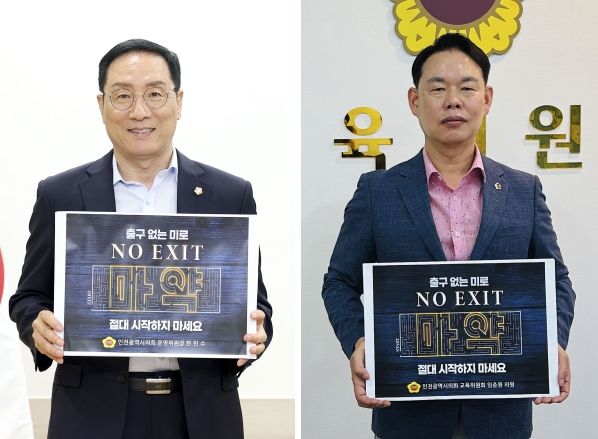 [제주교통복지신문 김강석 기자] 인천광역시의회 교육위원회 한민수(국·남동5·의회운영위원장)·임춘원(국·남동1) 의원이 사회문제로 대두되고 있는 마약 근절을 위해‘NO EXIT’캠페인에 동참했다.
