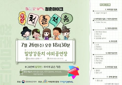 [제주교통복지신문 김강석 기자] 2023년 문화가 있는 날 청춘마이크 경상권 공연이 26일 오후 6시 30분 밀양강둔치 야외공연장에서 열린다.