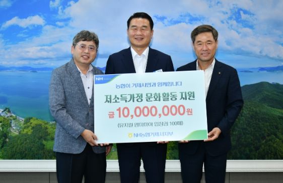 이날 기부식에는 농협은행 거제시지부 김창배 지부장을 비롯하여 관계자 3명이 참석했으며, 거제문화예술회관에서 공연하는 뮤지컬 맘마미아 R석 공연 티켓(1,040만원상당) 총 100장을 기부했다.