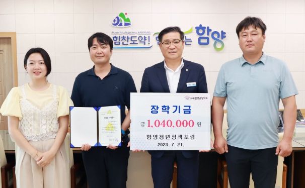 또한 7월 21일에는 함양청년정책포럼(대표 김민곤)에서 지역 학생들을 돕기 위한 방법을 모색 중 회원들이 십시일반 모은 104만원을 함양군장학회 장학금으로 기탁하게 됐다. 함양청년정책포럼은 평소 함양군에서 추진하는 청년정책활동에 참여와 더불어 환경정화 플로깅, 연탄나눔 등의 봉사활동을 꾸준히 실천하고 있다.