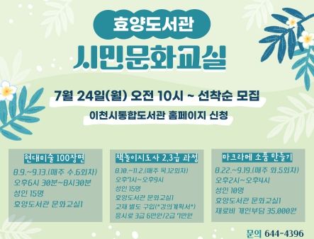 수강생 모집은 7월 24일 월요일 오전 10시부터 선착순으로 모집하며 자세한 내용과 일정은 이천시통합도서관홈페이지에서 확인할 수 있다.