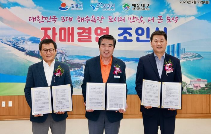 [제주교통복지신문 김강석 기자] 전국 3대 해수욕장으로 유명한 보령시와 강릉시, 해운대구는 22일 보령머드테마파크에서 김동일 보령시장과 김홍규 강릉시장, 김성수 해운대구청장, 관계 공무원 등 50여 명이 참석한 가운데 자매결연 조인식을 가졌다.