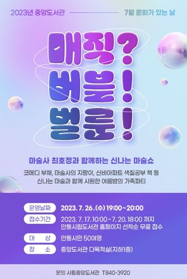 [제주교통복지신문 김강석 기자] 안동시립 중앙도서관에서는 7월 문화가 있는 날을 맞아 오는 26일 수요일 19시에 다목적실에서『마술쇼-매직?버블!벌룬!』공연을 진행한다.