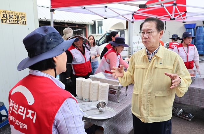 송인헌 군수는 지난 22일 원이담마을을 방문해 재해구호협회 봉사자들을 격려하고 피해주민을 위로했다.