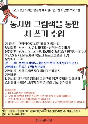 이 프로그램은 동시와 그림책을 읽고 마음에 든 장면을 골라 시로 창작해보는 것으로 오는 8월 12일부터 9월 16일까지 매주 토요일 오전 10시부터 12시까지 5회차로 진행된다.
