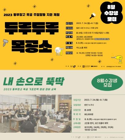 청주시문화산업진흥재단이 운영하는 동부창고가 24일부터 8월 7일까지 목공 기초인력 양성 장비교육 ‘내 손으로 뚝딱’과 목공 주말활동 지원체험 ‘두루두루 목공소’ 2개 프로그램의 8월 수강생을 모집한다.