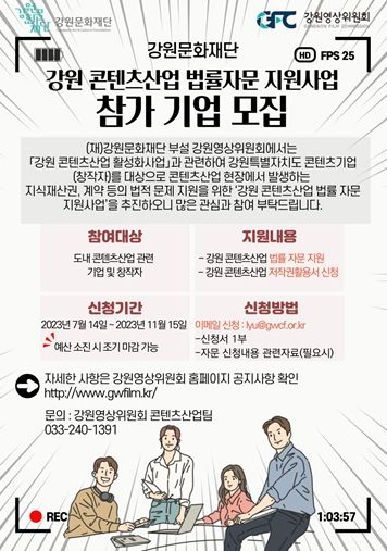 법률 자문과 저작권 활용서 신청은 11월 15일 16시까지 가능하며, 예산 소진 시 선착순으로 지원 신청을 마감한다. 자세한 공모 내용은 강원문화재단 홈페이지와 강원영상위원회 홈페이지를 통해 확인할 수 있다.