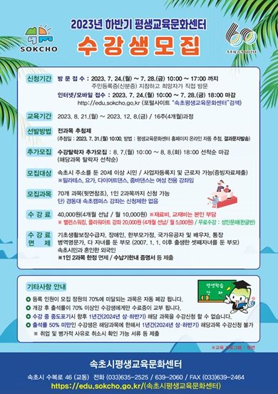 수강신청은 속초시에 주민등록이 되어 있는 시민과 속초시 소재 사업체 근로자도 신청 가능하고 하반기 평생학습강좌 교육기간은 8월 21일부터 12월 8일까지 16주(4개월) 과정으로 운영되며, 평생학습강좌 종료일 12월 8일에는 평생학습 어울림한마당이 문화예술회관 대공연장 및 전시실에서 수료식, 발표회, 전시회를 개최하고 평생학습강좌를 마무리한다.