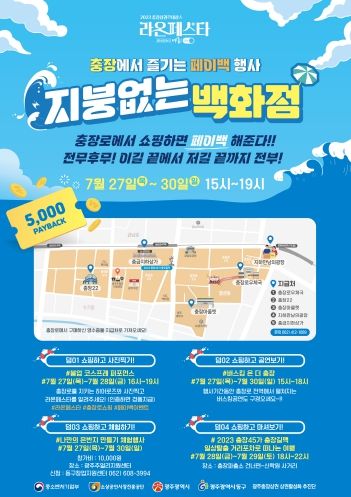 이번 행사는 충장상권 르네상스사업 일환으로 진행되는 라온페스타 ‘사계(四季) 드림(DREAM)’ 콘셉트에 따라 ‘지붕없는 백화점! 충장에서 즐기는 페이백(payback·상품 구입 시 지불한 돈을 현금으로 돌려받는 것)’을 주제로 지역경제 활성화를 위해 마련됐다.