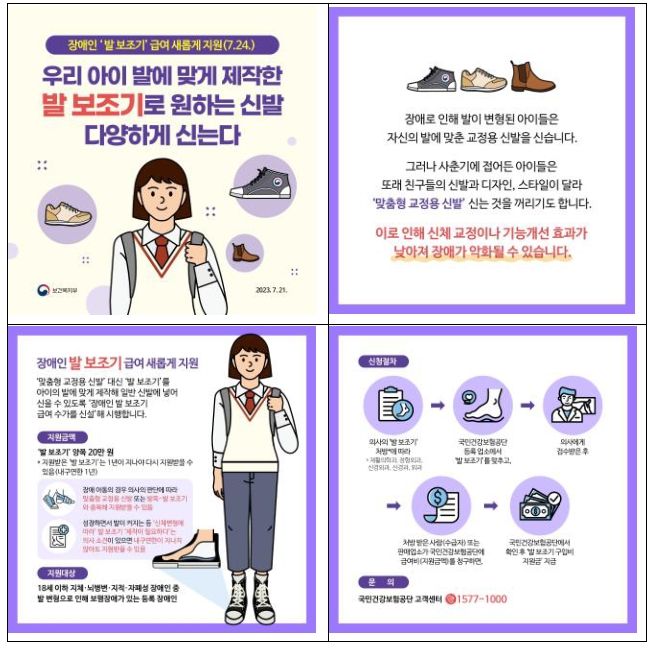 [제주교통복지신문 김강석 기자] 보건복지부는 18세 이하 지체․뇌병변․지적․자폐성장애 아동의 변형된 발 교정․보완 및 보행장애 개선을 위해 장애인 보조기기 보험급여 품목 중 ‘발 보조기’를 7월 24일부터 새롭게 추가한다고 밝혔다.