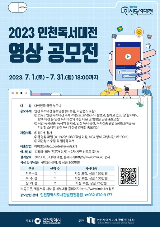 우선 인천시는 우수 콘텐츠 발굴을 위해 ‘2023 인천 독서대전 영상 공모전(7/1~7/31 접수)’과 ‘2023 작은도서관 우수사례 공모전(8/1~8/31 접수)’을 진행한다. 창의적이고 대중적인 영상을 선정해 행사를 널리 홍보하고, 작은도서관 우수사례 발굴과 함께 우수 결과물은 독서대전에서 인천시민과 공유하게 된다.