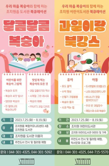 이번 북큐레이션은 복숭아 산지 조치원 도서관 2곳 ▲조치원읍 도서관(대첩로 76, 조치원읍 복합커뮤니티센터 4층) ▲조치원 어린이도서관(신흥샛터3길 3)에서 진행된다.