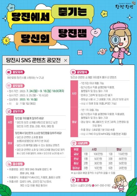[제주교통복지신문 김강석 기자] 당진시가 당진의 매력을 알릴 수 있는 콘텐츠를 확보하고자 전 국민을 대상으로 2023 당진시 누리소통망(SNS) 콘텐츠 공모전을 개최한다.