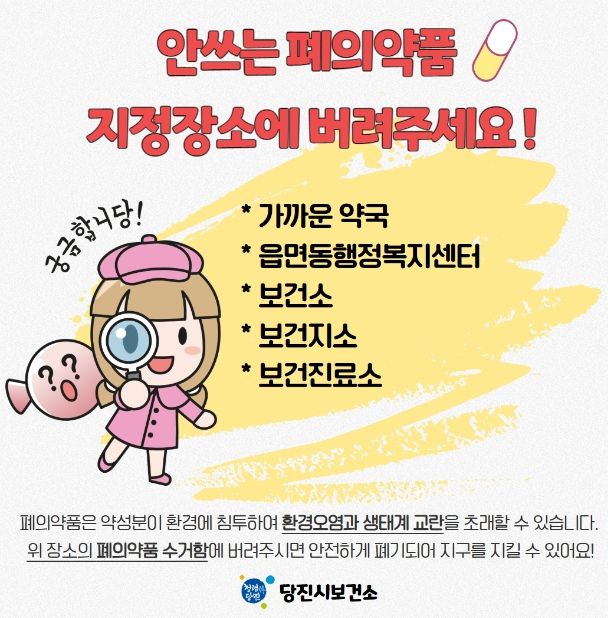 [제주교통복지신문 김강석 기자] 당진시보건소가 생태계 교란 등 환경오염을 일으킬 수 있는 폐의약품의 적절한 처리를 당부했다.
