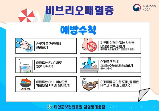 군 보건의료원에 따르면, 비브리오패혈증은 제3급 법정 감염병으로 균에 오염된 어패류를 날로 먹거나 덜 익혀 먹을 때 발생한다. 특히, 상처난 피부를 바닷물에 접촉할 때나 문신 시술 후 얼마 되지 않은 상태에서 해수욕을 할 때도 감염될 수 있어 여름철 바다를 찾는 피서객들의 각별한 주의가 요구된다.