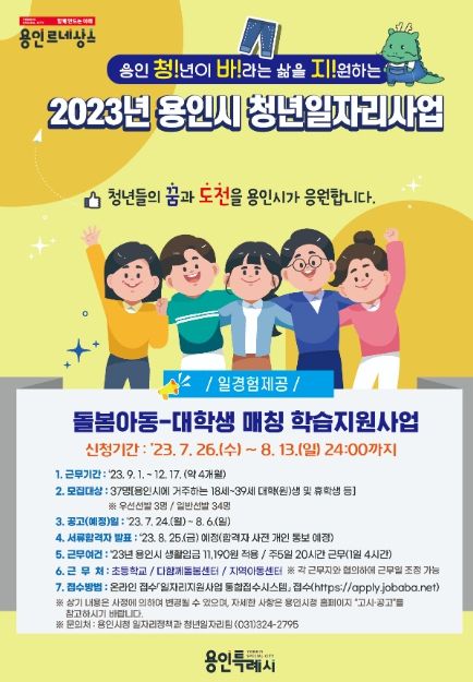 [제주교통복지신문 김강석 기자] 용인특례시는 오는 26일부터 다음달 13일까지 지역 내 돌봄사각지대에 있는 아동을 위한 학습도우미로 활동할 대학생 37명을 모집한다고 24일 밝혔다.