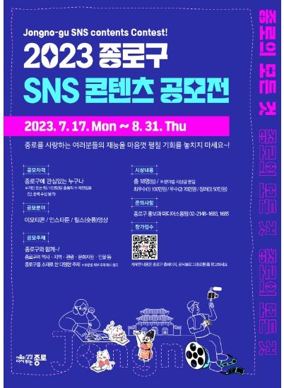 구는 이달 17일부터 오는 8월 31일까지 '종로구 SNS 콘텐츠 공모전'을 개최한다. 주제는 ‘종로구와 함께~! 종로구의 모든 것!’으로 정했다. 종로의 역사, 지역, 문화자원, 인물 등을 소재로 한 ▲이모티콘 ▲인스타툰 ▲릴스(숏폼) 영상을 발굴해 시상하고 구민과 가까이서 소통하며 구 브랜드 가치 역시 높이려는 취지다.
