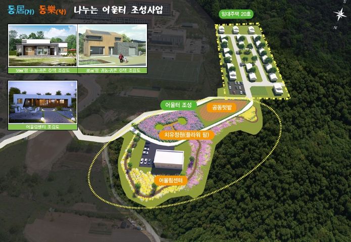 먼저 어울림센터는 연면적 400㎡에 주민교육실(주민작업실, 회의실) 1실, 치유원예 체험실, 나눔주방 등을 갖추고 있으며, 이곳에는 주거 정착유도 프로그램, 소득증대 유도 프로그램, 선주민과의 화합 프로그램 등을 운영해 귀농·귀촌인의 유입 및 원주민과의 화합을 도모할 예정이다.
