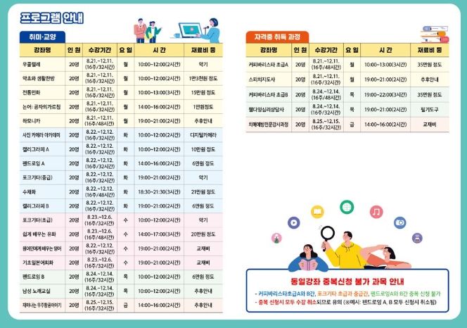 수강신청은 7월 31일 오전 9시부터 8월 11일 오후 6시까지 사천시청 홈페이지를 통해 가능하며, 각 강좌별 모집인원 초과 시 컴퓨터 추첨을 통해 수강생을 선정한다.