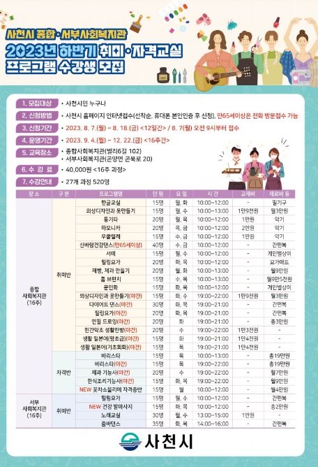 [제주교통복지신문 김강석 기자] 사천시 종합·서부사회복지관은 2023년 하반기 취미·자격교실 프로그램 수강생을 모집한다고 23일 밝혔다.
